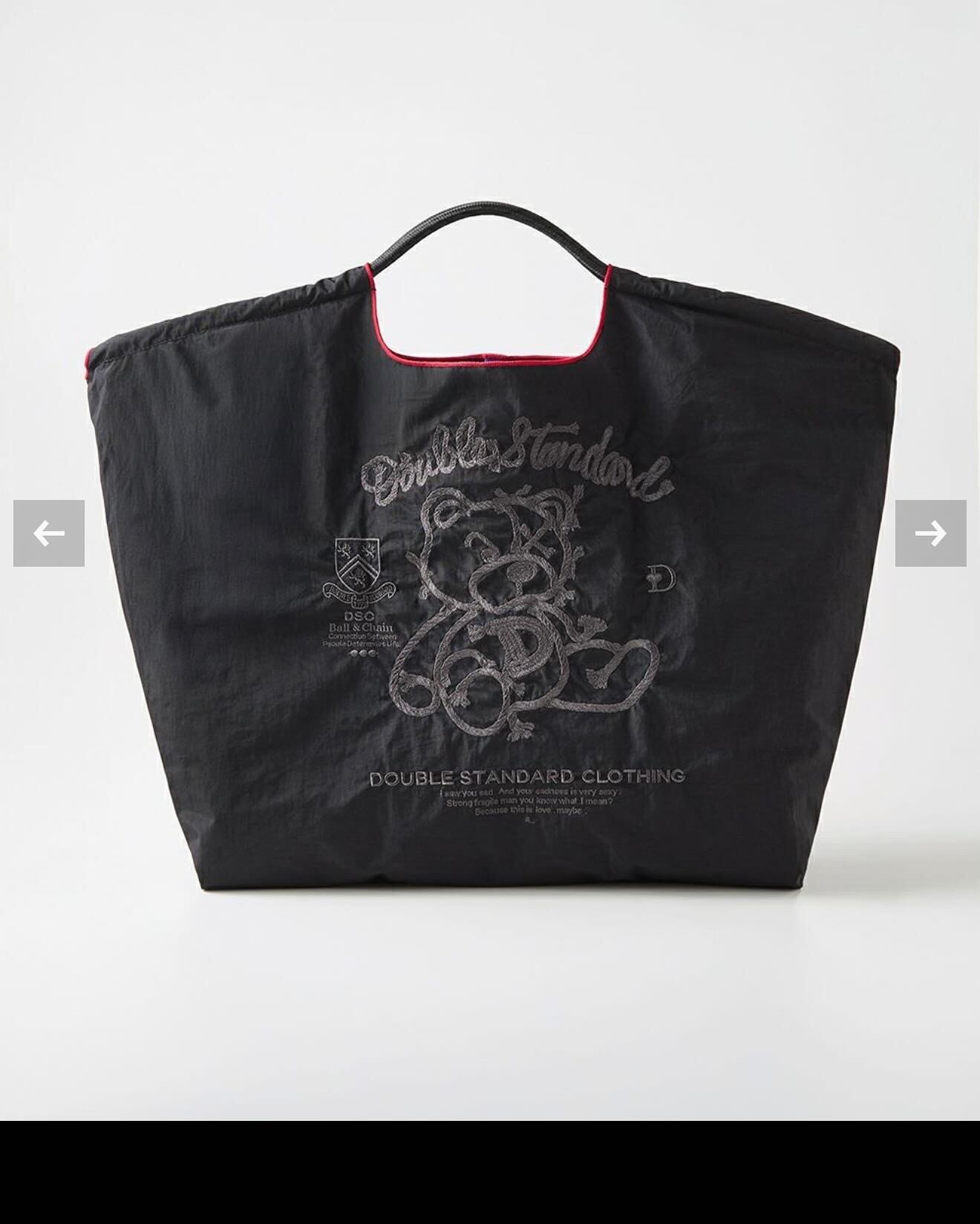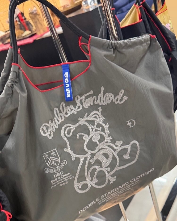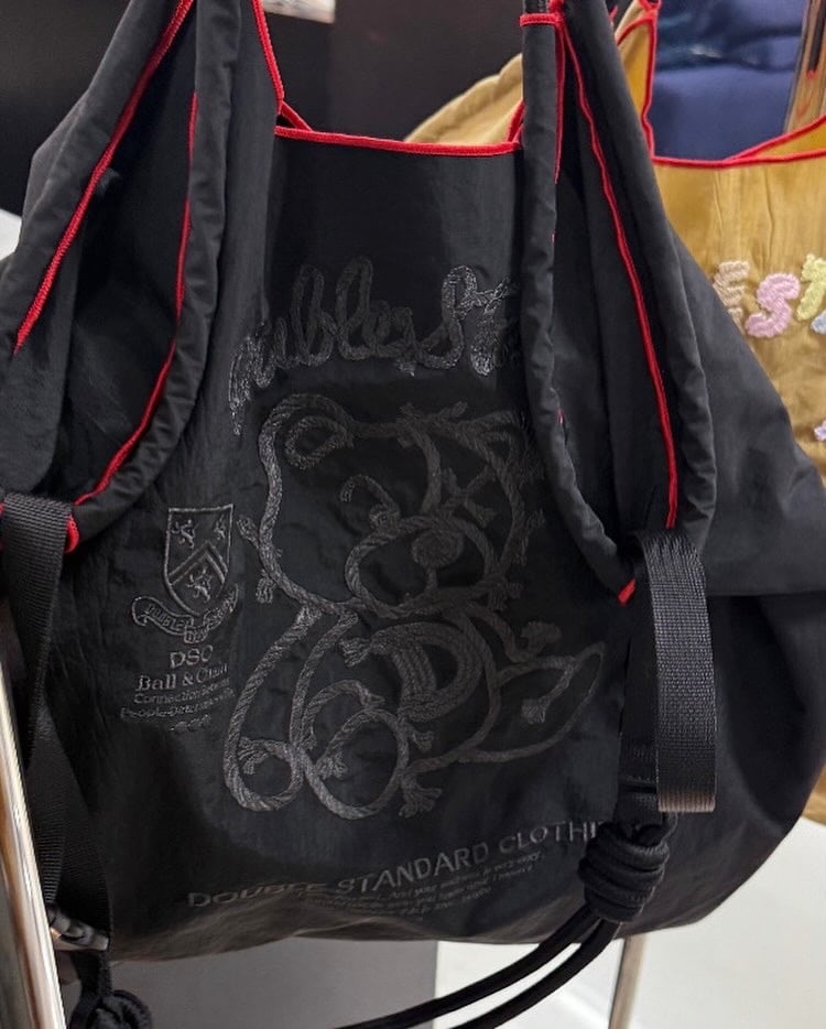ロープをモチーフに刺繍で描かれたベアが目を引く、シンプルながらに個性が際立つダブスタらしいデザインのショッピングバッグ。 まるで無造作に絡んだロープのようなベアは、甘すぎず、大人っぽいスタイルに絶妙にマッチします。モノトーンの刺繍で仕上げられているためスタイリングに取り入れやすく、性別問わず持ち運べるのも魅力のひとつです。 また、しっかりとしたナイロン素材で軽く、たっぷり荷物が入る大容量設計なので普段使いや旅行にも◎