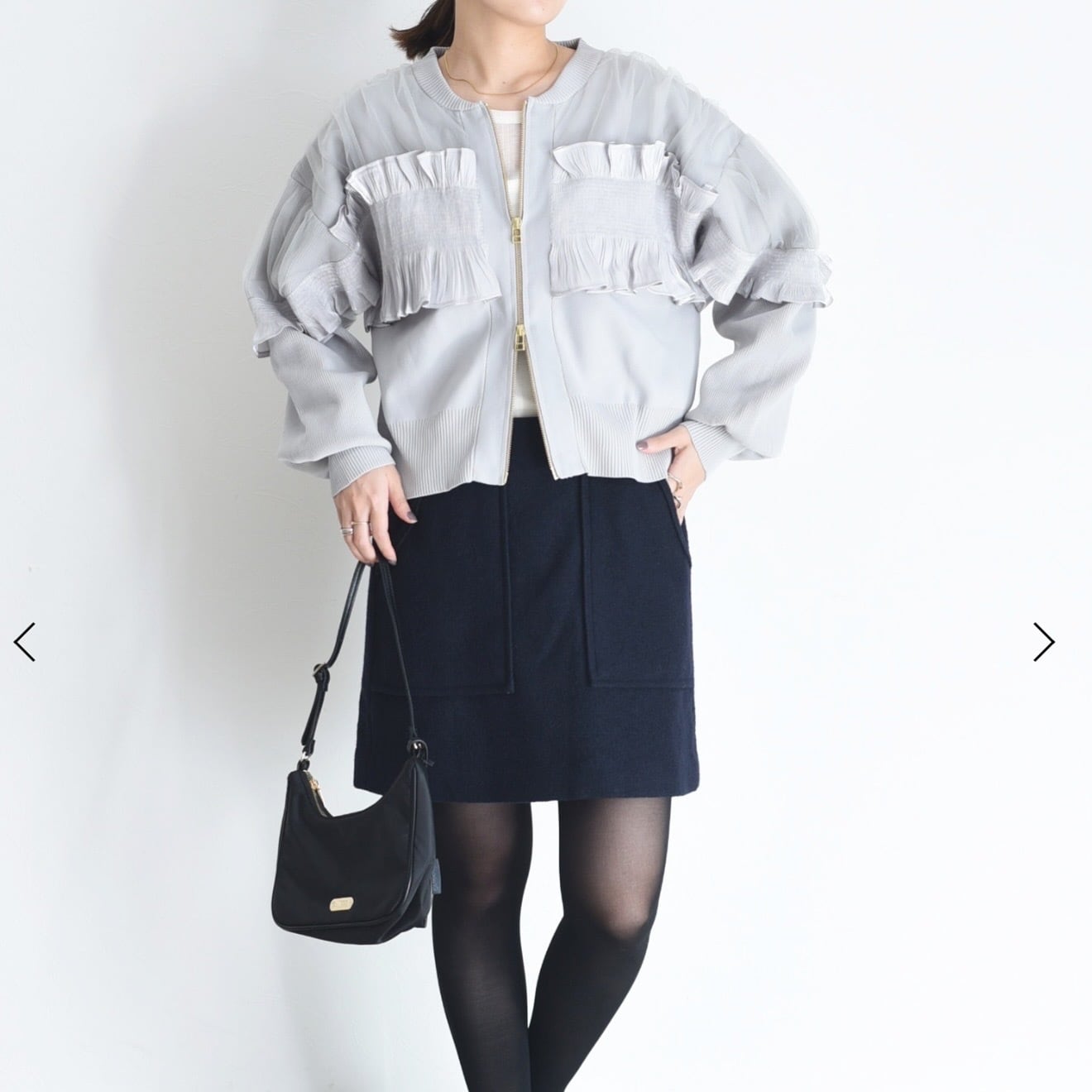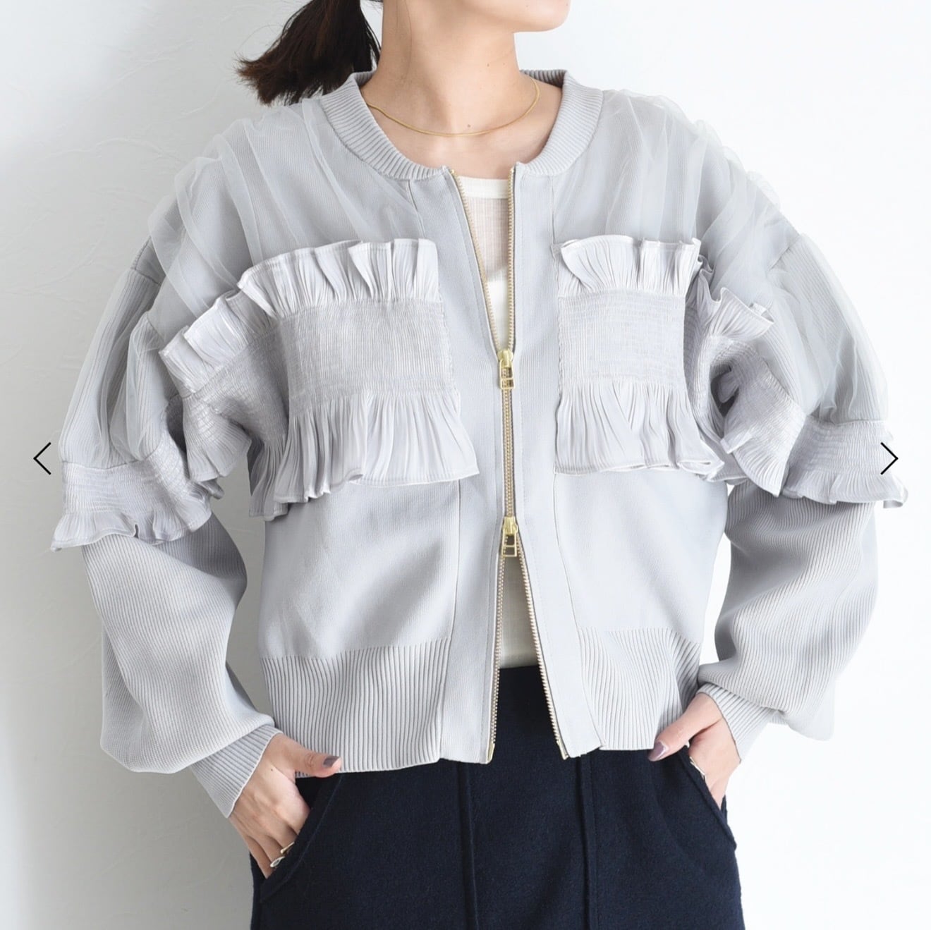 シャーリングフリルのポイントが映えるニットブルゾン。