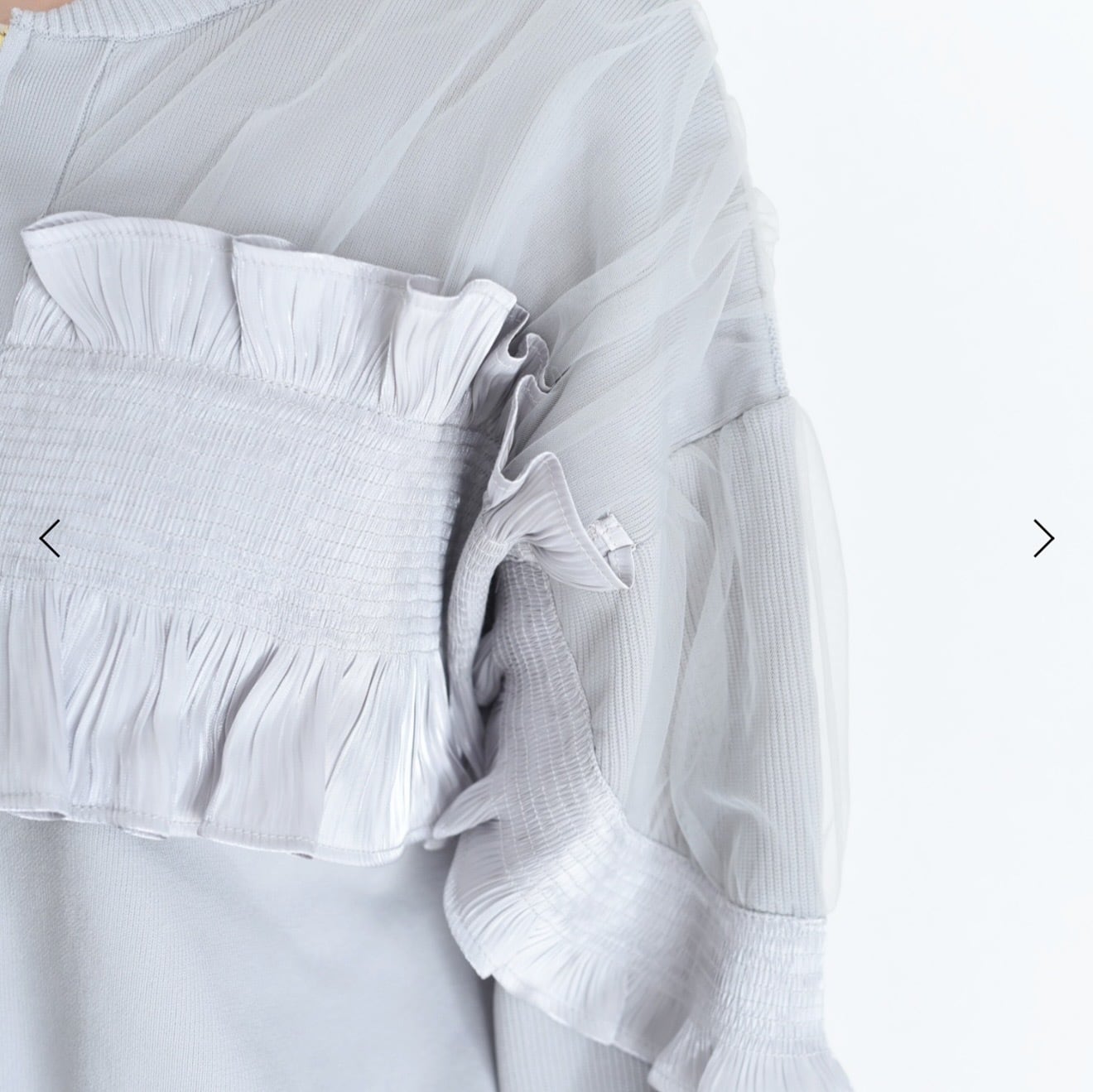 微光沢な割繊素材のシャーリングフリルが甘過ぎずモードな印象に。