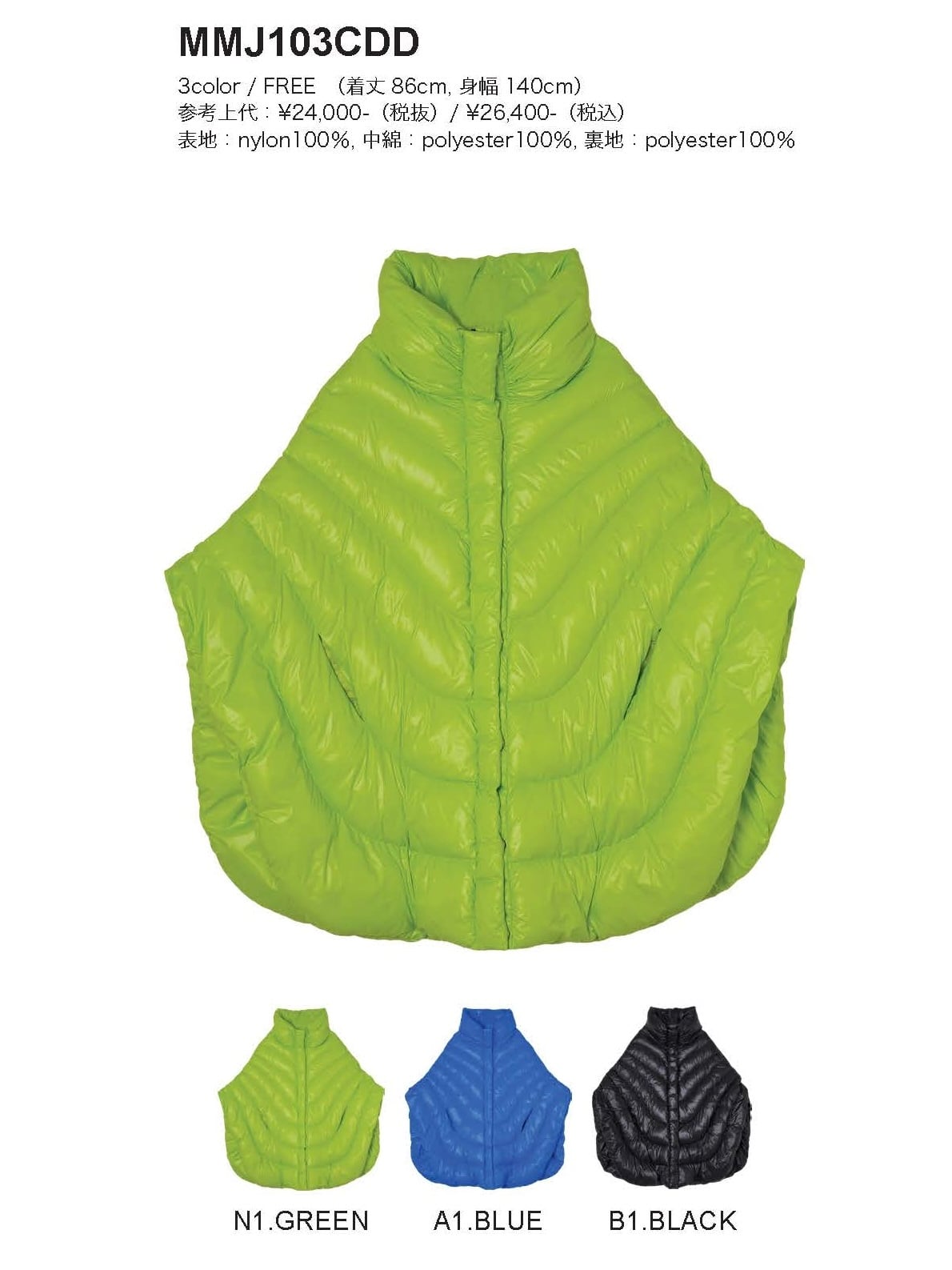 表地:nylon100%, 中綿:polyester100%, 裏地:polyester100%