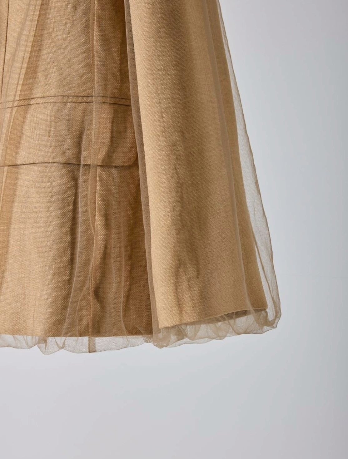 リネンライクな素材のノーカラージャケットに、ふわりとチュールを重ねた“春のはじまり”にぴったりな一着。