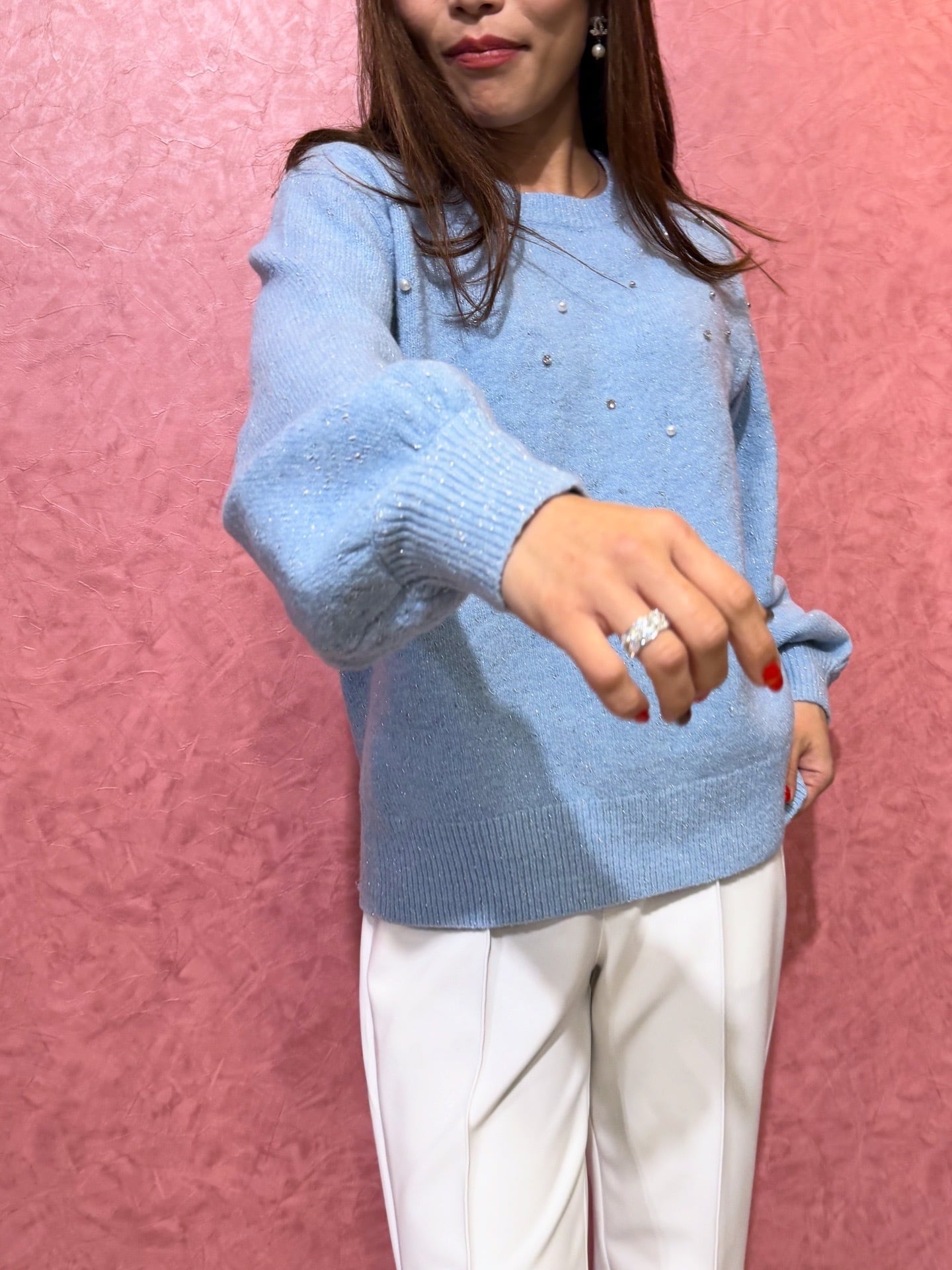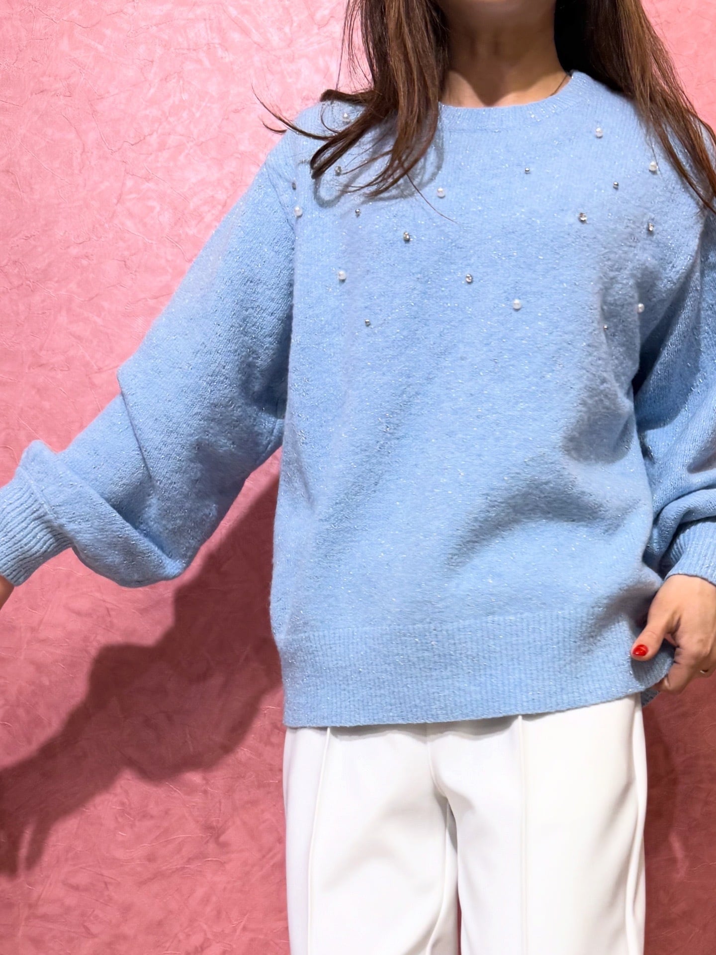 上品なラメ糸をミックスした、ほんのりきらめくニットプルオーバー。