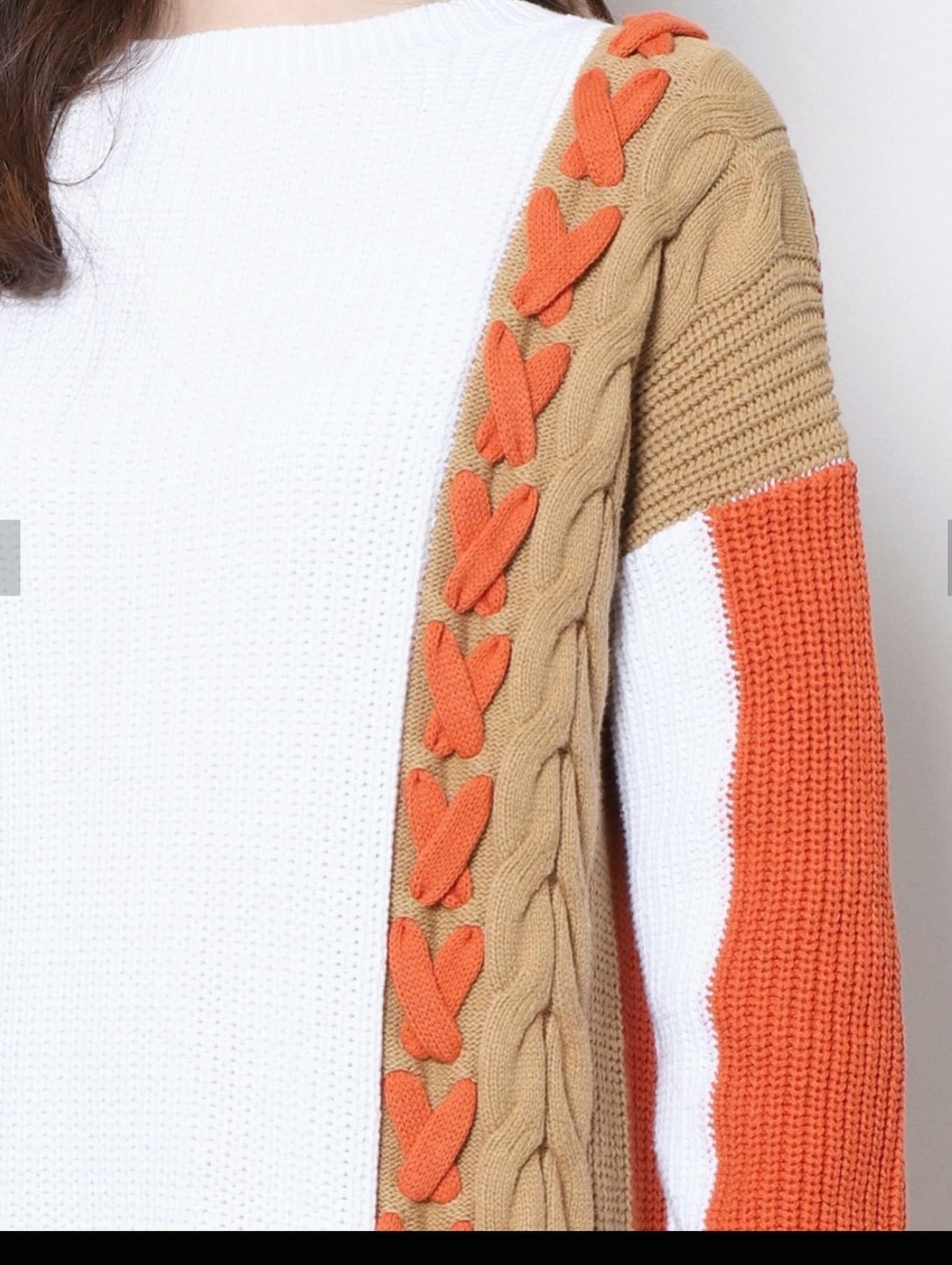 配色使いと様々な編地をパッチワークのように繋ぎ合わせて着るだけでぐっとお洒落に決まる1枚。