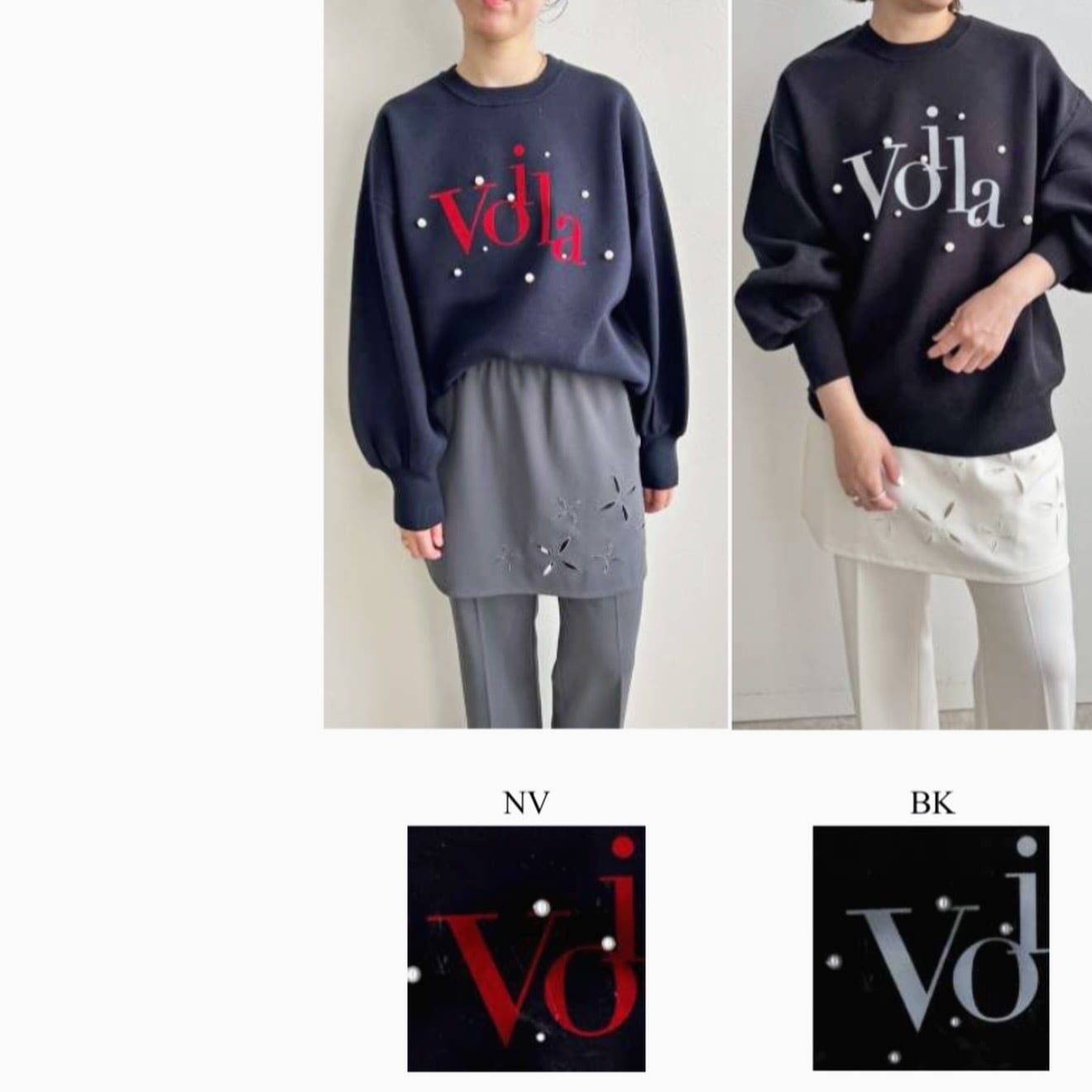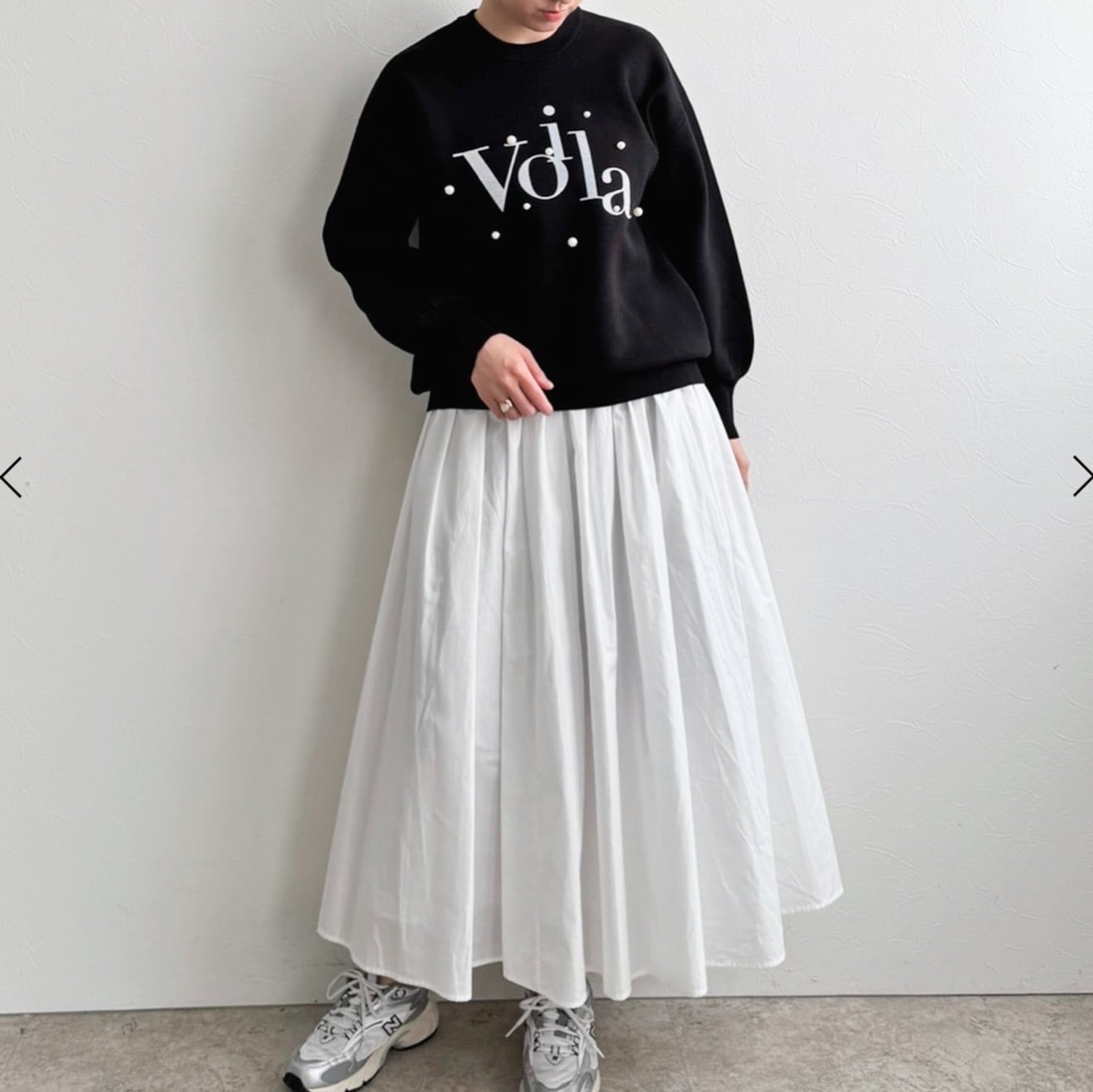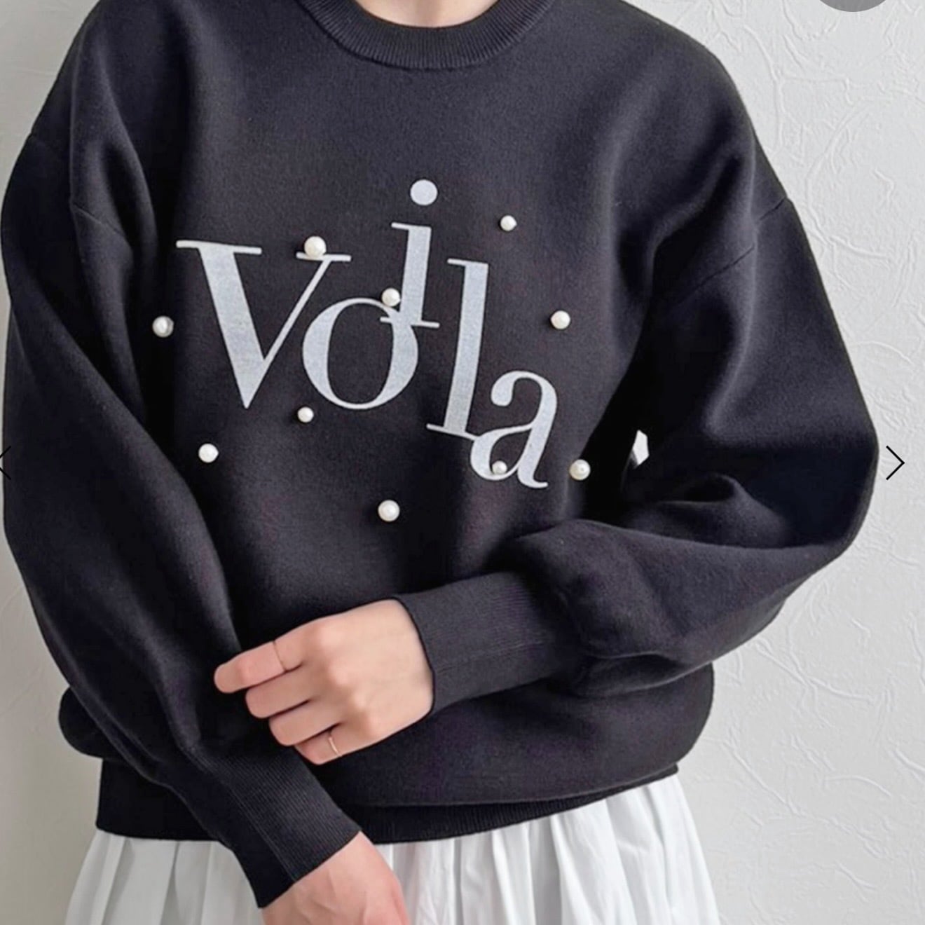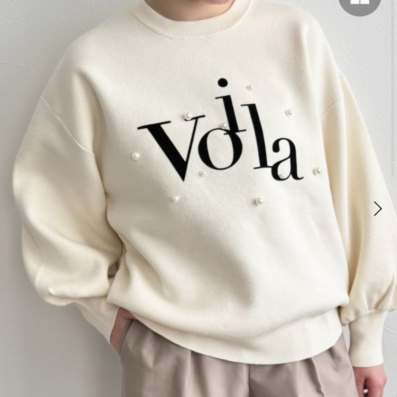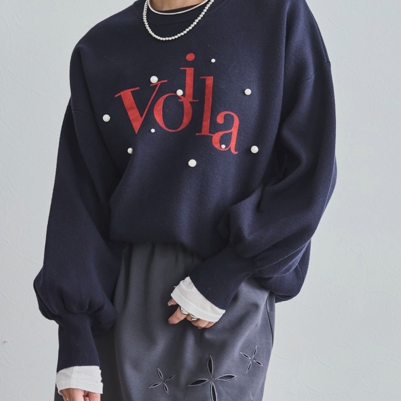 パールとフロッキーロゴのフェミニンカジュアルなニットトップス。