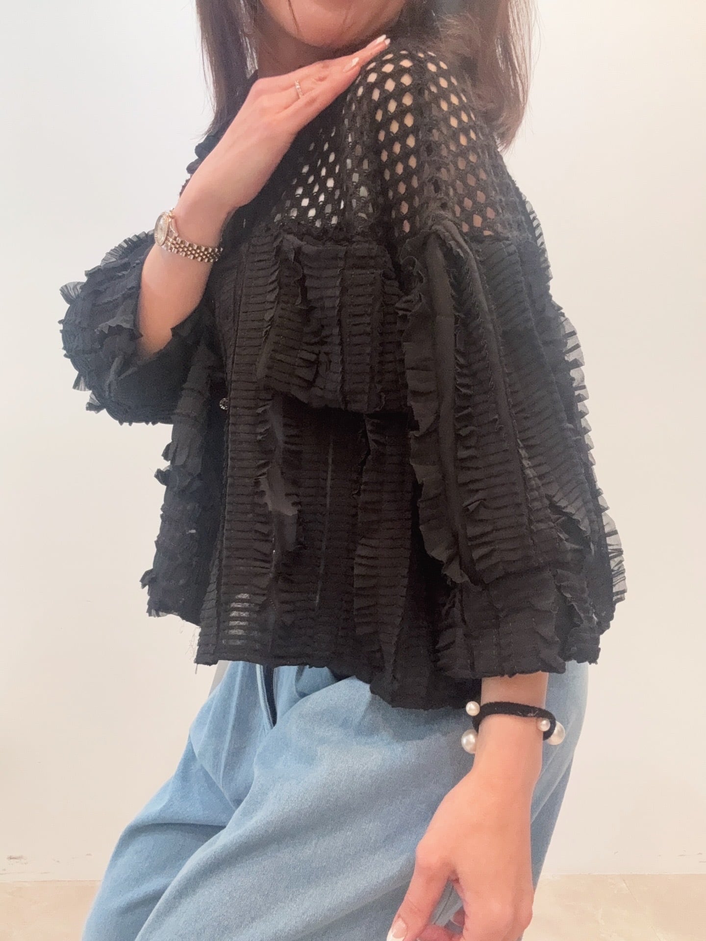 メッシュフリルコンビブラウス