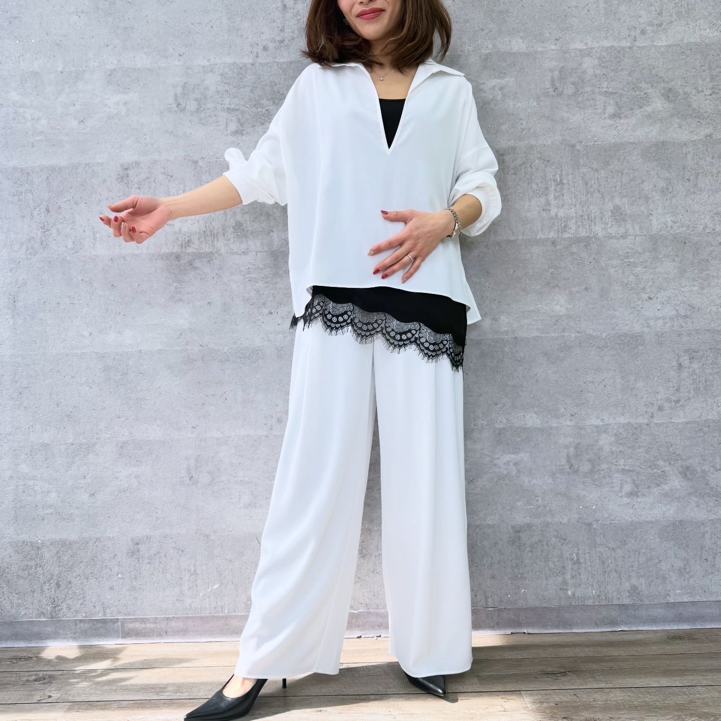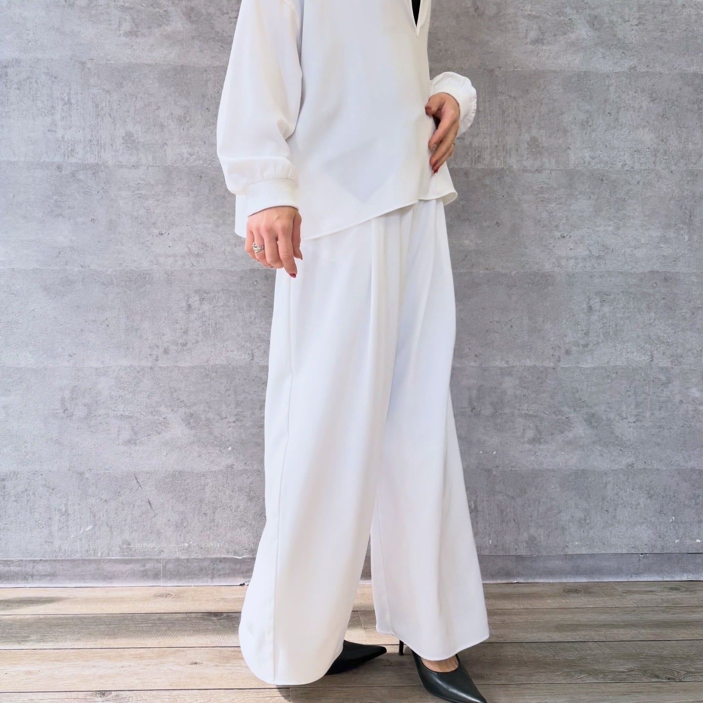 ややワイドで体のラインを拾わないシルエット。前ウエストに入ったタックが落ち感のある綺麗なシルエットを出します。ウエストまわりはゴム仕様になっているのでイージーな履き心地が叶います。同素材のセットアップ着用もおすすめです。