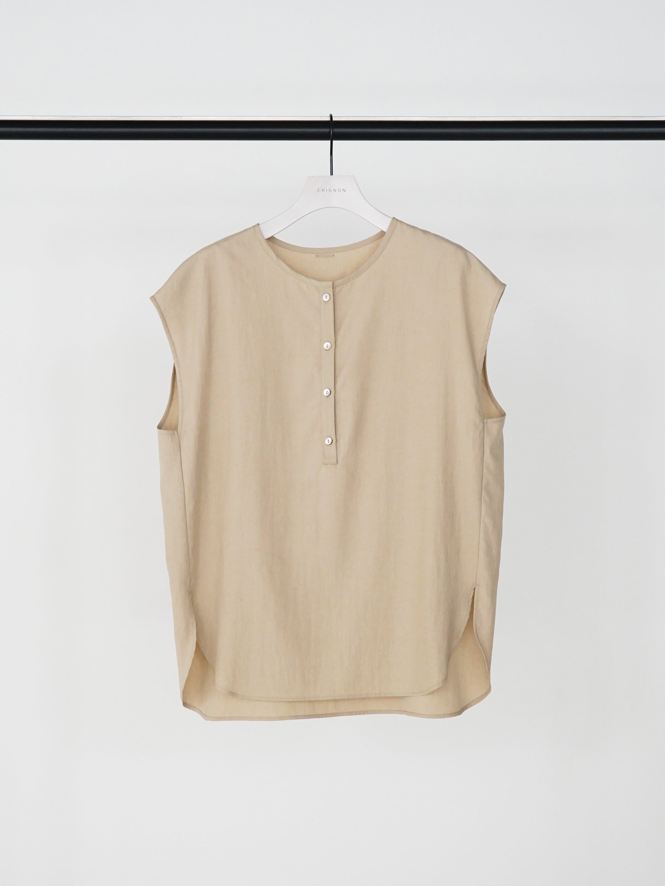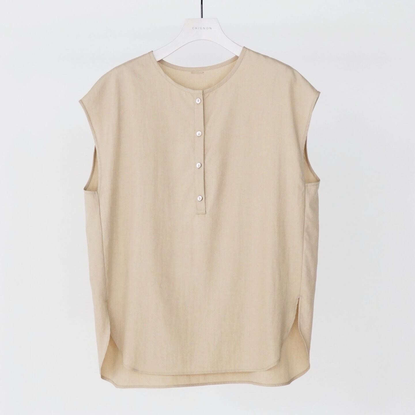 ミニマルな表情の中にさりげない女性らしさを込めたヘンリーネックブラウス。なめらかで落ち感のある素材が、シンプルなデザインに柔らかな陰影と上品なニュアンスを与えます。コンパクトな肩まわりとフレンチスリーブラインが腕をすっきり見せ、身体から程よく離れるシルエットでリラックスした着心地に。一枚着としてはもちろん、ジャンパースカートやジャケットのインナーとしても活躍する汎用性の高いアイテムです。同じ素材の[5563-635MK] クリーンフォルムOPとの組み合わせで新しい着こなしもお勧めです。