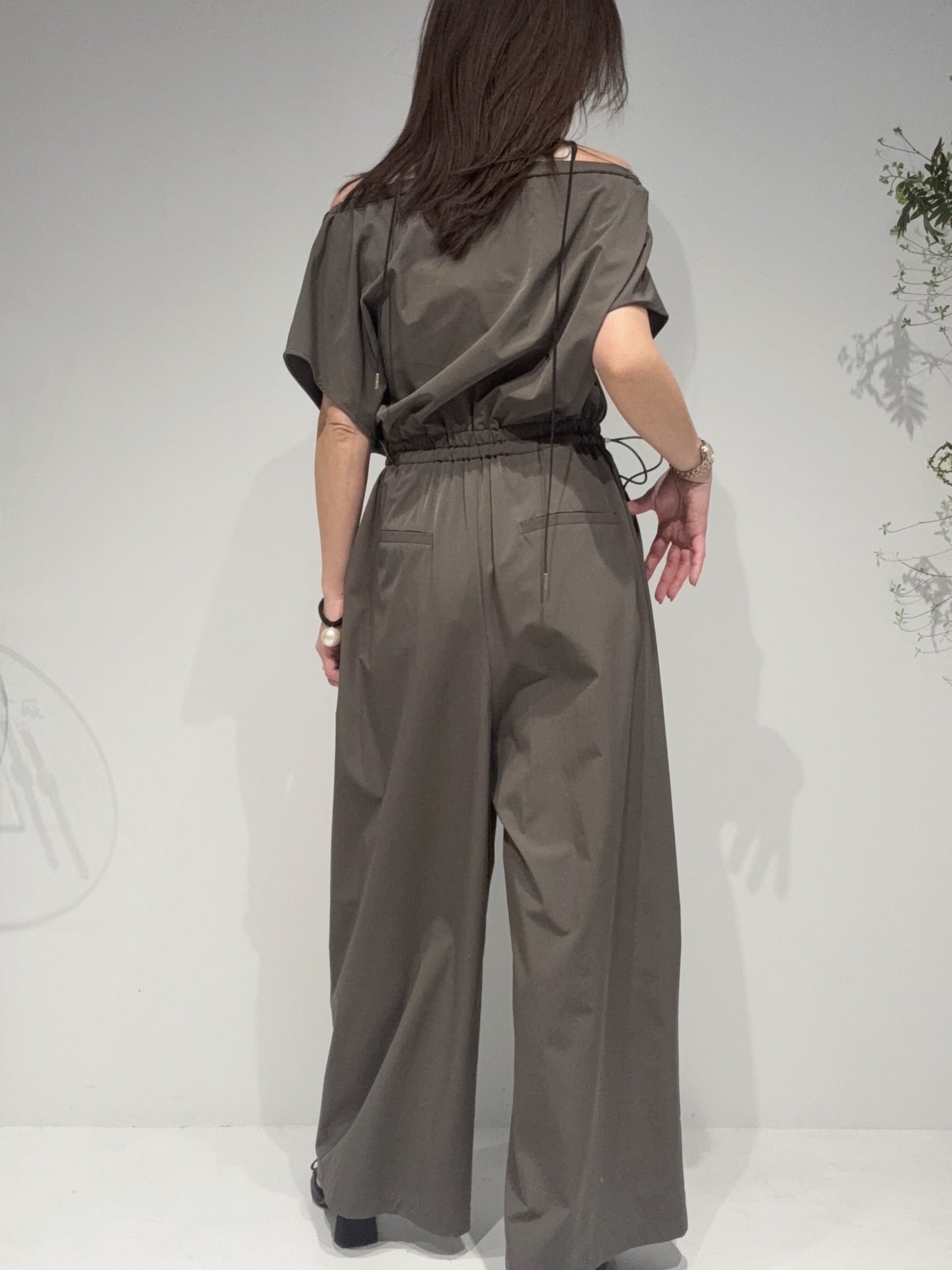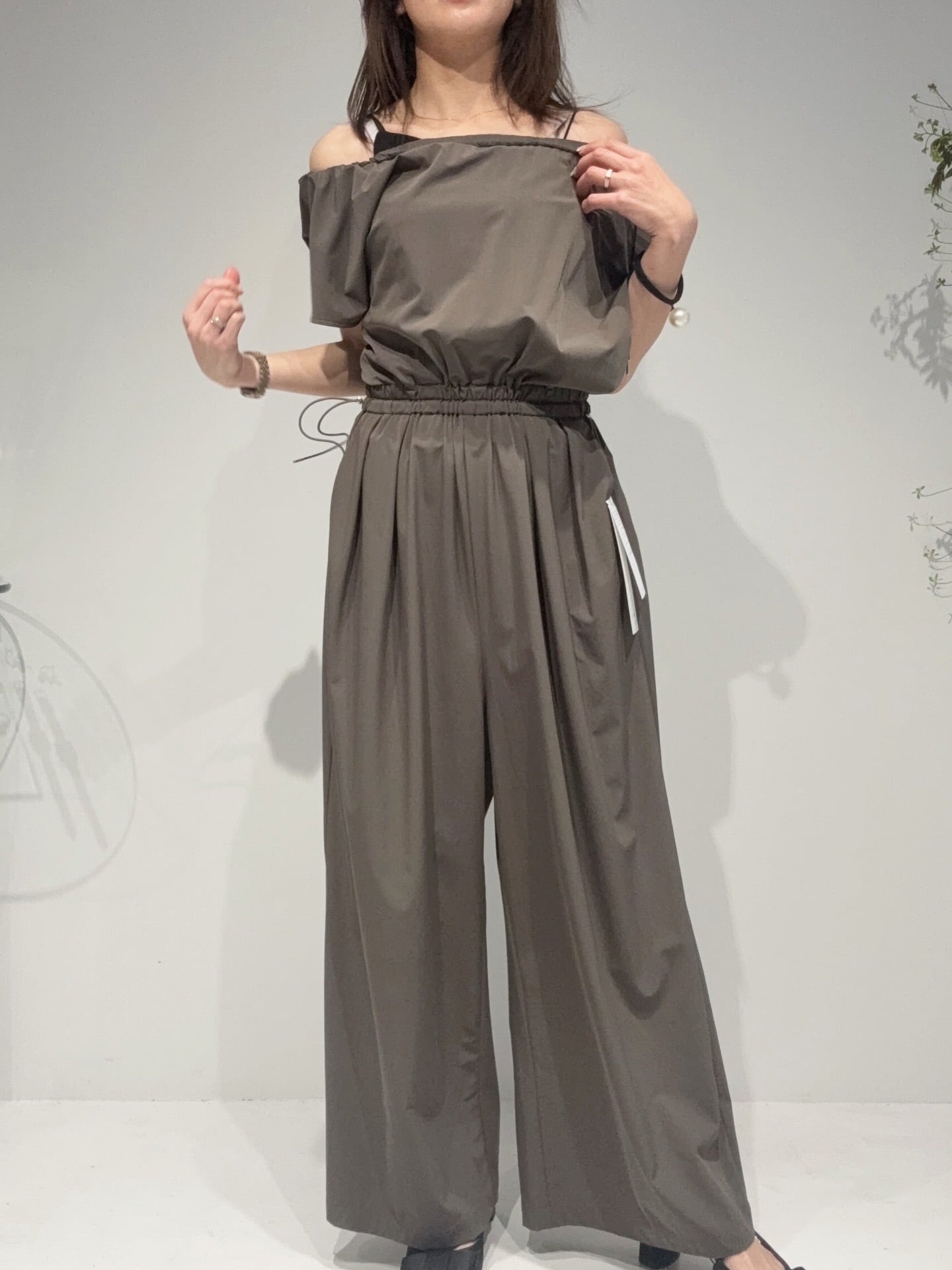 着方次第で表情が変わる、軽さと着やすさを兼ね備えたマルチウェイ仕様のオールインワン。ゴム入りのネックラインで、気軽に着脱でき、ウエストのドロストでウエストサイズの調整も可能です!ネックラインのアレンジやトップス部分をウエストに落としてアレンジを加えられて、ワンピース・オフショルダー・ベア風・パンツスタイルなど多彩な着こなしが楽しめます。上身頃に入れた繊細なギャザーと、落ち感のあるワイドパンツシルエットが身体のラインを拾わず、リラックスした着心地と洗練された印象を両立。素材も着た時にひんやりとする素材感で分量がありながら快適に過ごせます。またオールインワンならではのトイレ問題も、