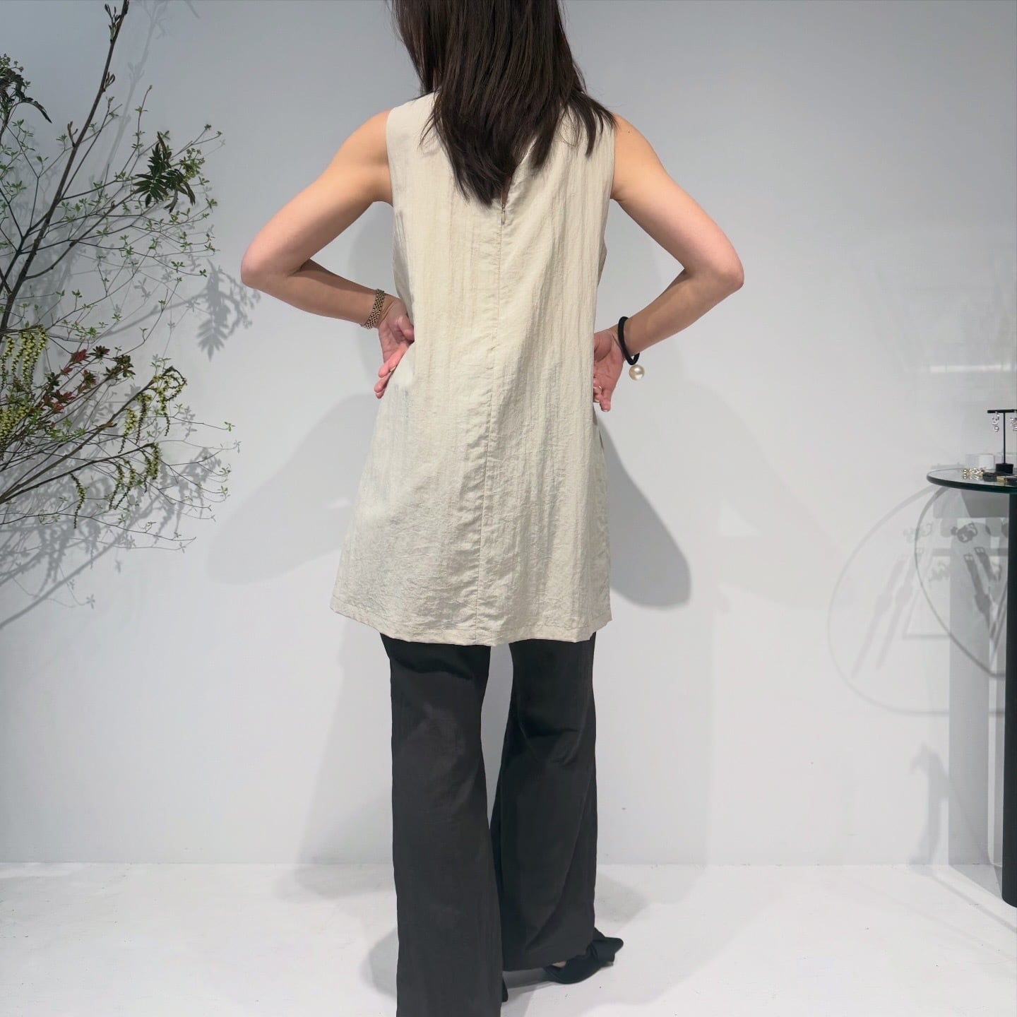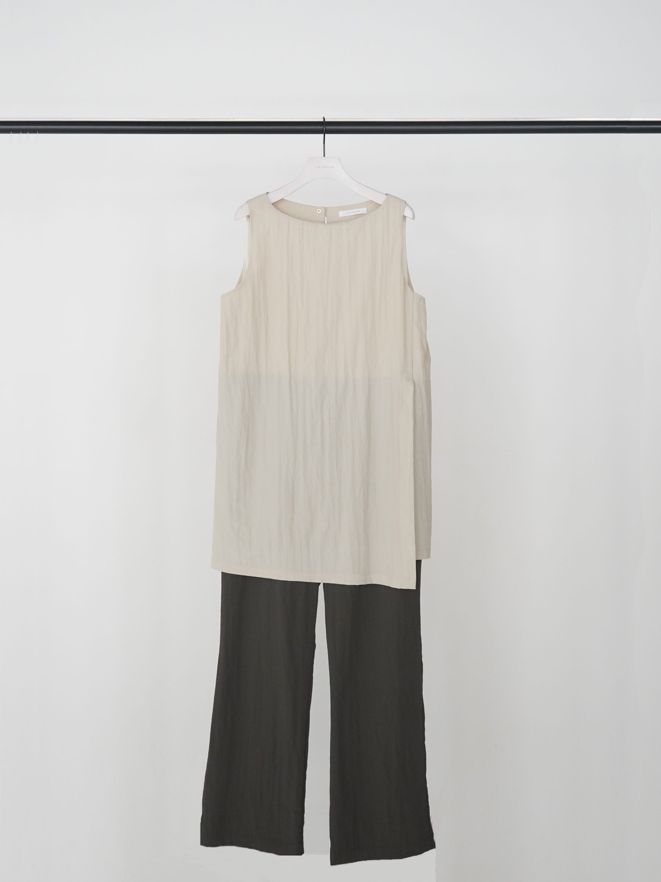 チュニック丈のトップスとパンツを組み合わせた、モード感あふれるコンビネゾン。アシンメトリーなチュニックデザインが印象的で、シンプルながらも洗練された存在感を放ちます。ボートネックとすっきりとした肩幅のラインが上半身を美しく見せ、1枚でさらりと着るだけでスタイリングが完成。気になるヒップまわりを自然にカバーするチュニック丈や、ソフトフレアのボトムシルエットで、スタイルアップ効果があるのも嬉しいポイント。落ち感のある素材が縦のラインを強調し、全体をすっきりとした印象にまとめます。素材は、ナチュラルなシワ感のあるさらっとした肌触り。バンブーの再生繊維を混紡した糸を使用し、接触冷感のある涼やかな着心地で、長い夏でも快適に着用できます。秋には長袖インナーをレイヤードしたり、ジャケットを羽織ったりと着回しも自在。
