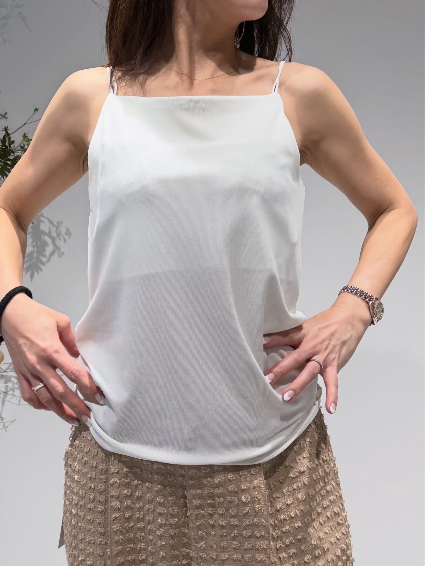 O/WHITE、BEIGE、BLACK SIZE F Delivery 5/下旬〜6/上旬 華奢なダブルストラップが印象的な、ミニマルなデザインのキャミソール。身頃は程よく身体に沿うサイズ感で、ラインを拾いづらい肌離れの良いテレコは着心地抜群。ゴールドのコードエンドが、さりげないモード感を添えています。フロントを少し高めに設定したアメスリライクなデザイン。ありそうでなかった、モードな着こなしにぴったりのキーアイテム。バックはノーマルな高さに設定しているので、スタイリングによって使い分けも可能。長さの差をつけた2本のストラップは、外側は肩紐として少し短めに、内側はアクセサリー感覚でも使えるよう長めに設定。ストレートに垂らしたり、チョーカーのように首元に回したり、バックでクロスさせたりと、さまざまなアレンジが楽しめます。肩紐の長さ調節も自在。フラットなスクエアラインがすっきりと洗練された印象に。シャツやカーディガンのインナーとしてヘルシーに。ジレやジャケットのインナーとして抜け感を楽しんで。1枚でも着映えし、レイヤード次第でシーズンレスに活躍する万能キャミソールです。