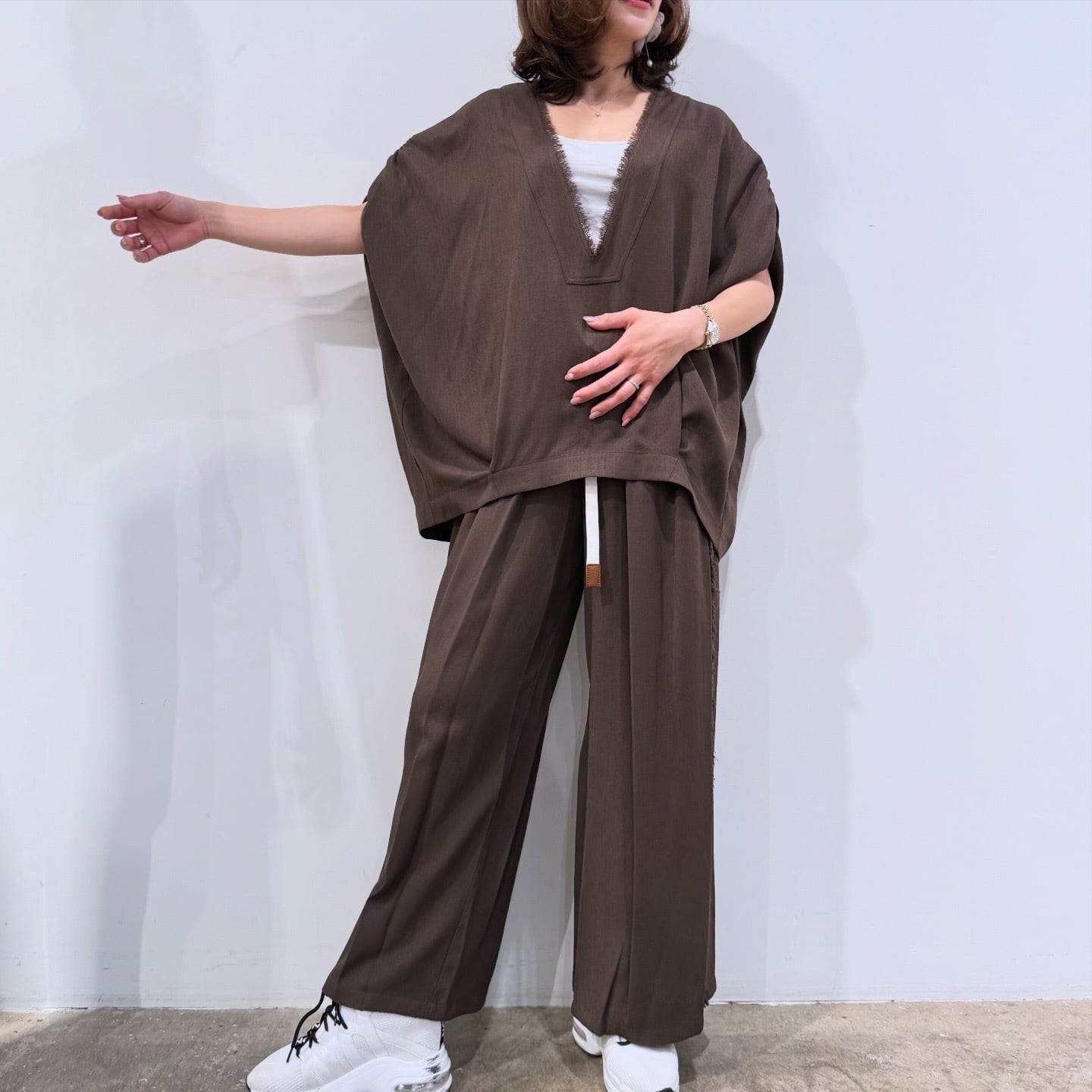 R/Tスラブ肩ギャザーフリンジノースリーブ