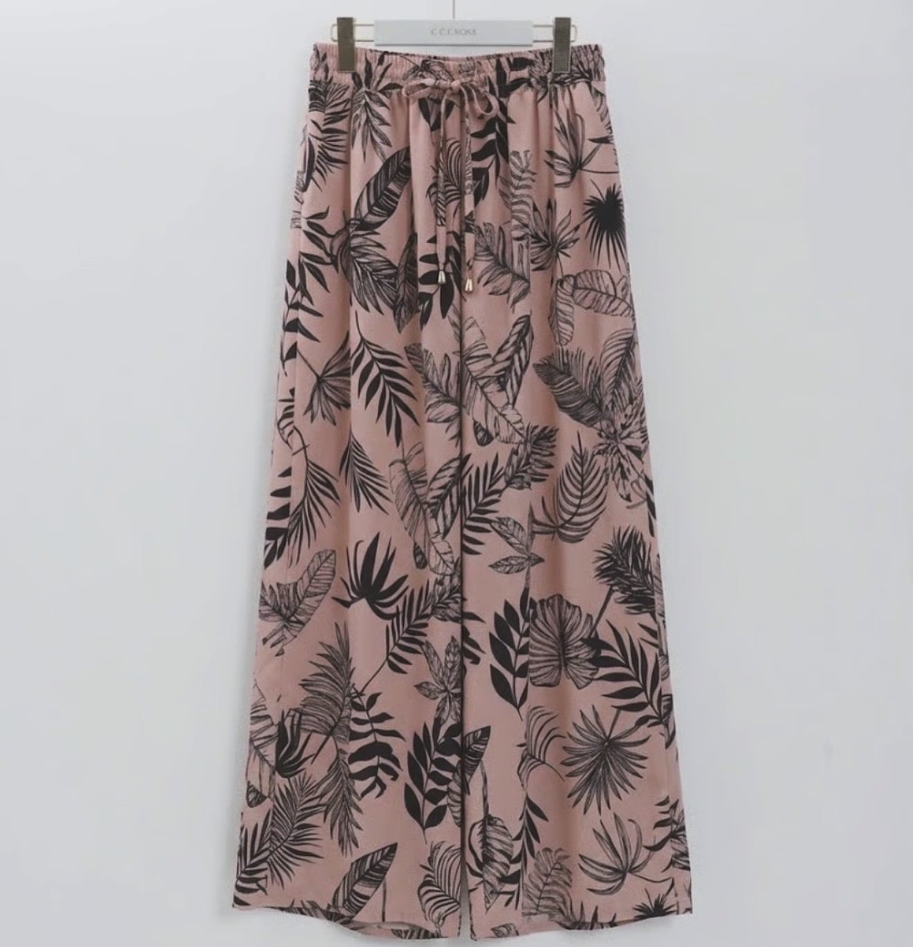 ダークトーンで仕上げた、大人の品格漂うリーフ柄のプリントパンツです。シワになりにくい素材を使用しているため、一日中美しい表情をキープできるのが魅力です。落ち着いた柄が甘さを抑え、洗練されたリラックススタイルを都会的に演出します。夏場に便利な1本です。