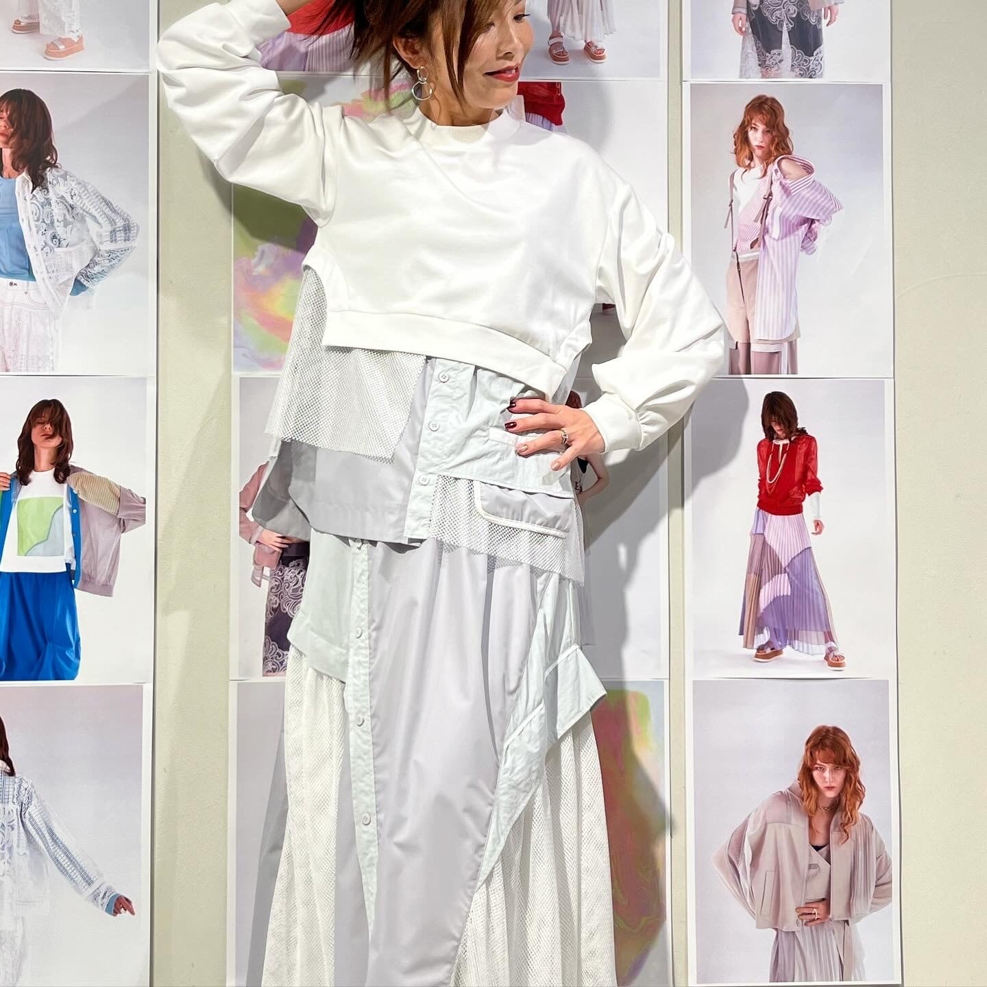 コットンスムースのプルオーバーにシャツをレイヤード風のコンビネーショントップス。上身頃はショート丈風のプルオーバーで、サイドの裾をカーブにカッティングしウエストをすっきりと見せ、袖はダーツで丸みを出したカーヴィーディティール。下身頃は左右で異なる生地を使用し、部分的にメッシュをコンビネーションすることでエッジを効かせたアウラアイラらしいアイテム。右はメッシュを上から重ね、左はメッシュを下に重ねておりポケットを配置、下から覗くパイピングの袋布も遊び心のあるデザイン。グレーとチャコールのストライプは濃淡が生まれ、立体感を際立たせる。無地は同系色の生地なのでスタイリングに合わせやすく、マットなナイロンタフタのコンビネーションがモードな印象。